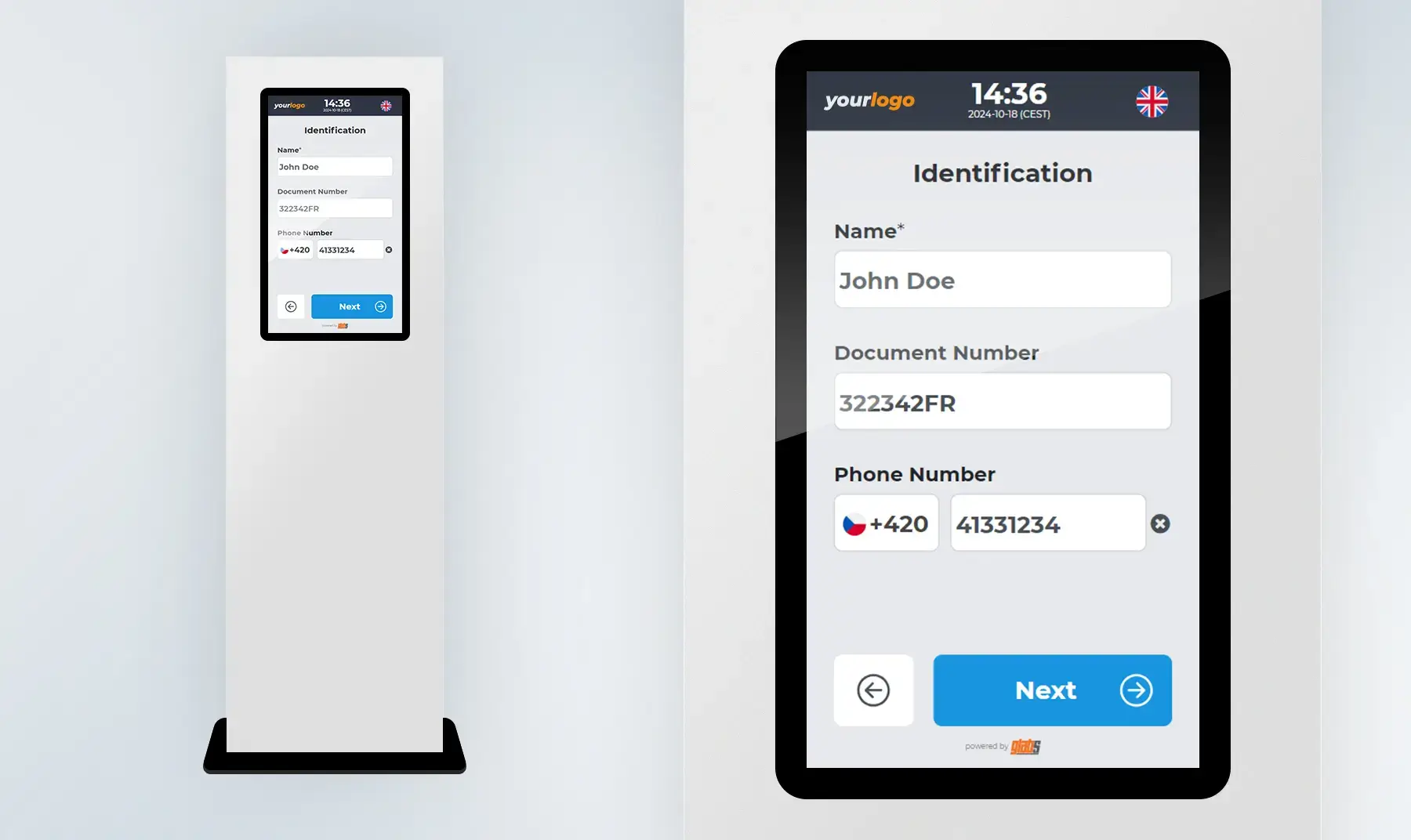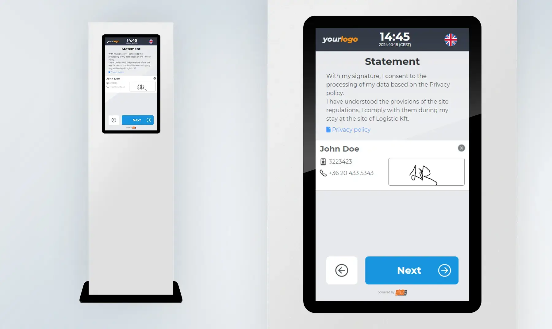 Visitors arriving at the site can check in quickly and independently via a Self Check-in kiosk. With multilingual support, the kiosk ensures a smooth check-in process while digitally presenting and requiring acceptance of data protection policies, site regulations, occupational safety regulations, and similar documents. All acknowledgements are logged and stored by the system.