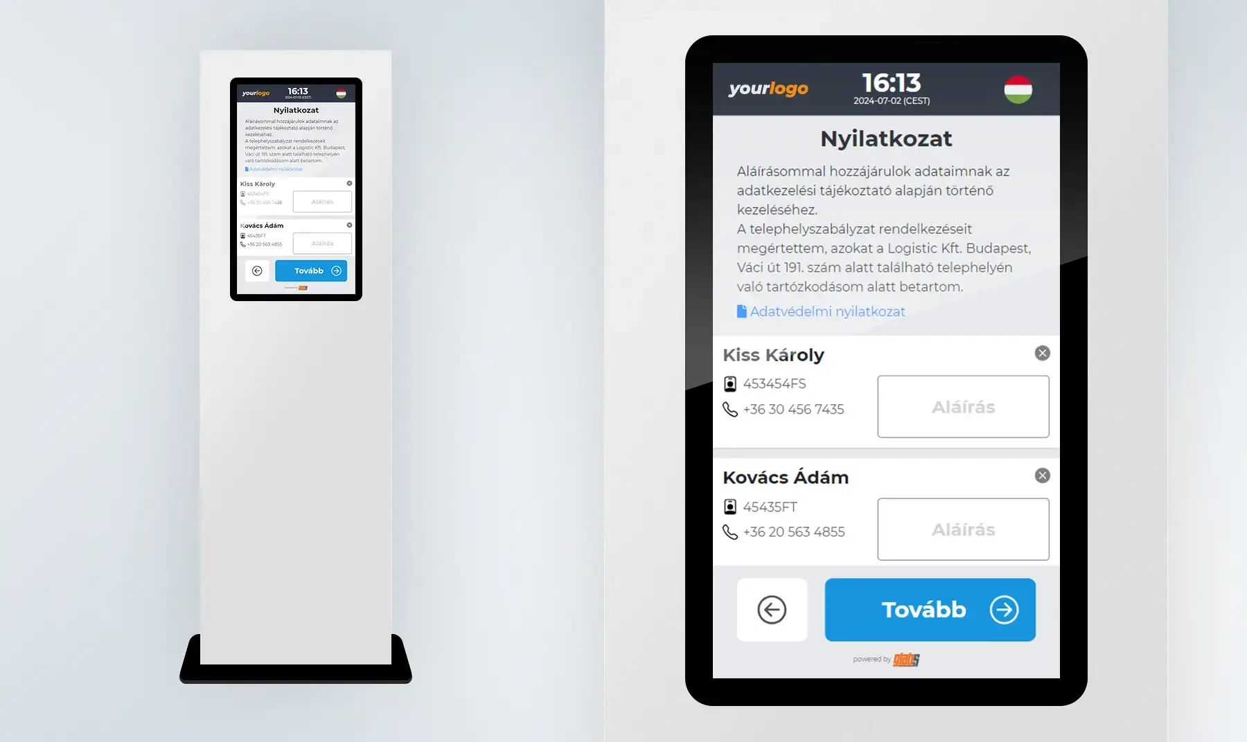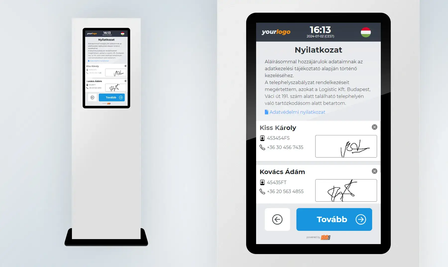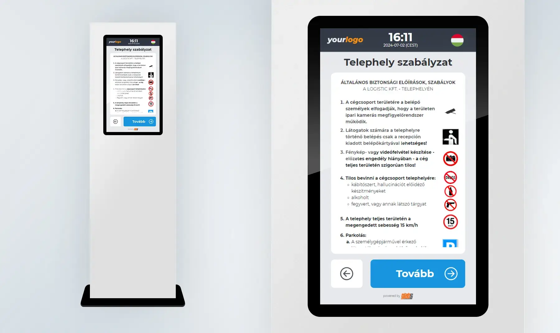 A telephelyre érkező vendégek Self Check-in kioskon keresztól gyorsan és önállóan jelentkezhetnek be. A Kiosk többnyelvű támogatással segíti a gördülékeny bejelentkezést, miközben a vendégekkel digitálisan elfogadtatja az adatvédelmi és telephelyi szabályzatokat, munkavédelmi szabályzatot, stb., amit a rendszer naplóz és tárol.