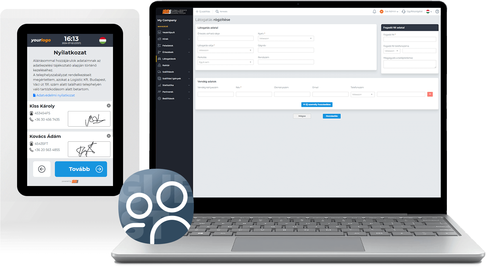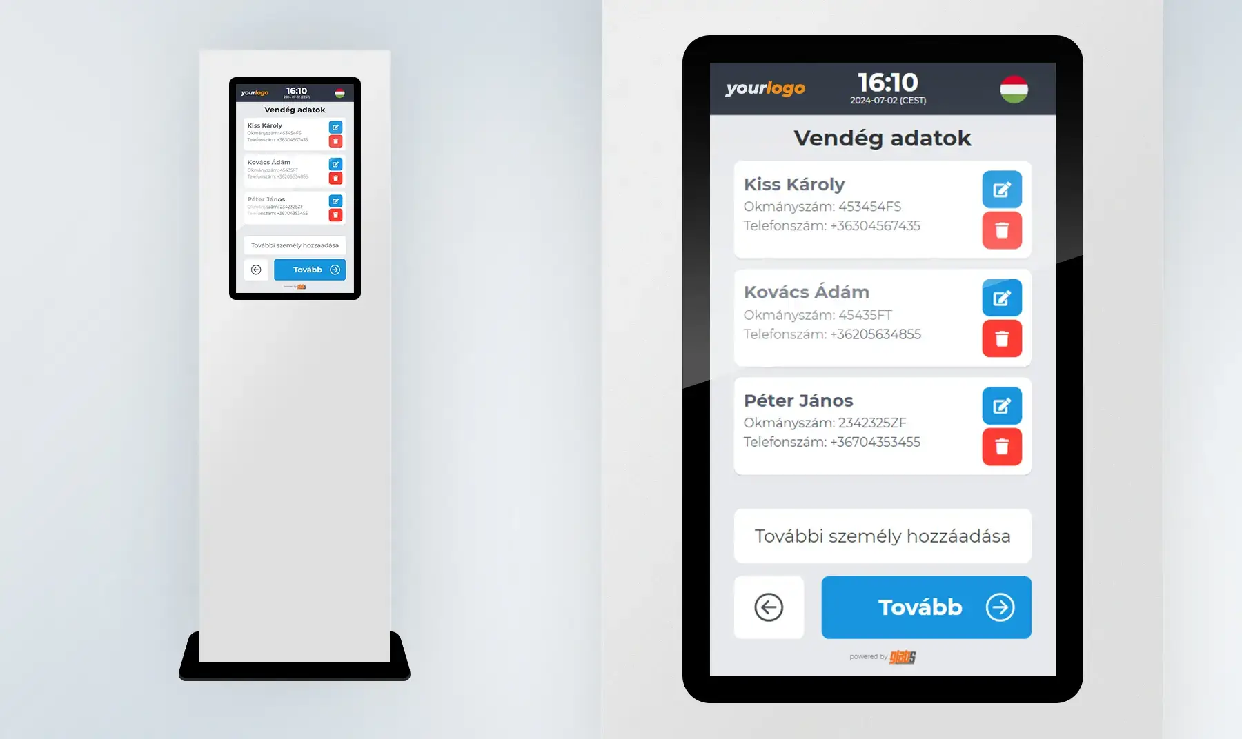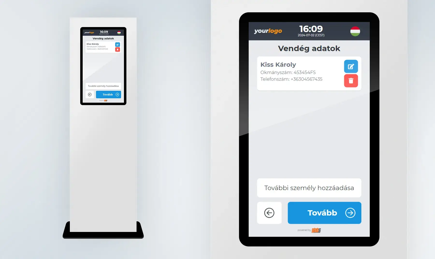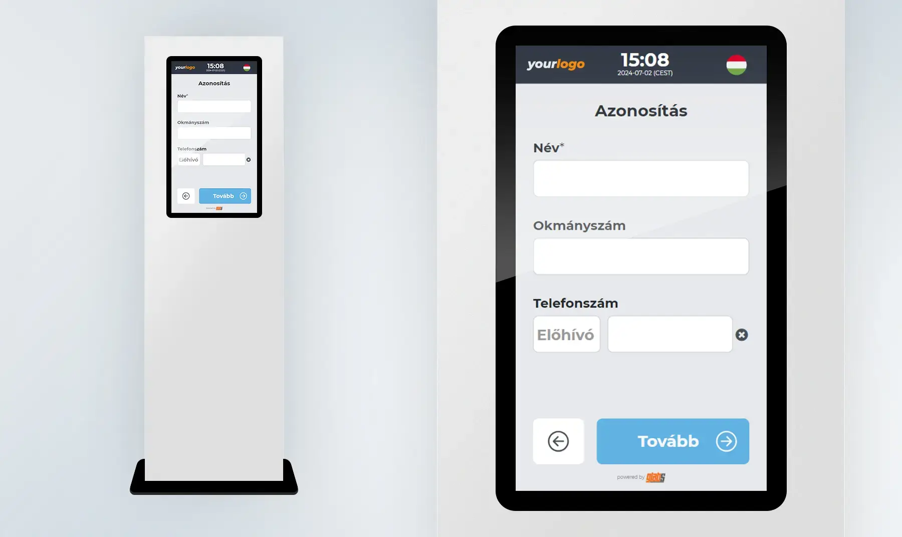 A telephelyre érkező vendégek Self Check-in kioskon keresztól gyorsan és önállóan jelentkezhetnek be. A Kiosk többnyelvű támogatással segíti a gördülékeny bejelentkezést, miközben a vendégekkel digitálisan elfogadtatja az adatvédelmi és telephelyi szabályzatokat, munkavédelmi szabályzatot, stb., amit a rendszer naplóz és tárol.
